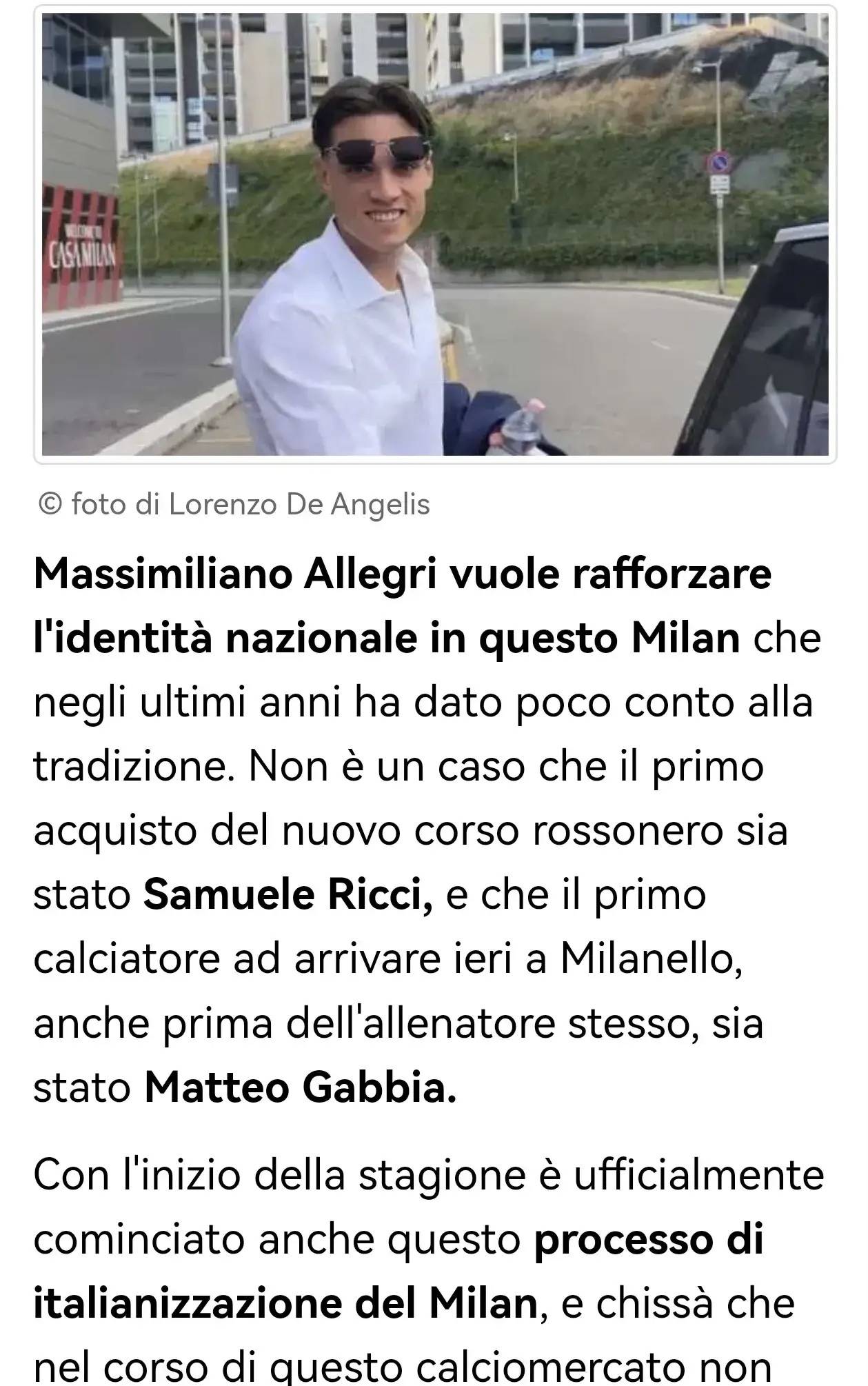 马西米利亚诺·阿莱格里希望在这支近年来对传统重视不足的米兰队中,强化本土球员的核心地位。新赛季红黑军团的首笔引援是萨穆埃莱·里奇,而昨天最先抵达米兰内洛的球员(甚至早于教练本人——是马特奥·加比亚),这并非偶然。
